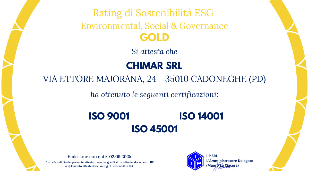 Chimar has achieved the ESG Sustainability Rating – Gold level, awarded by IIP, a milestone that certifies our journey towards a sustainable and responsible business model.